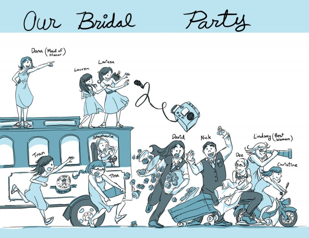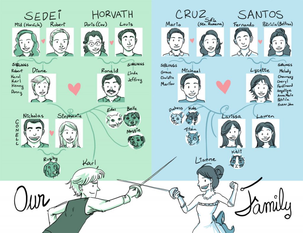 My fiance and I are creating a comic book as our wedding favors. Here’s one of the double spreads at the back of the book. When you marry, you marry the family!