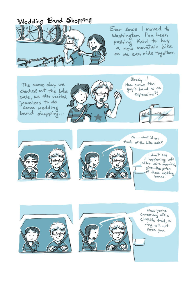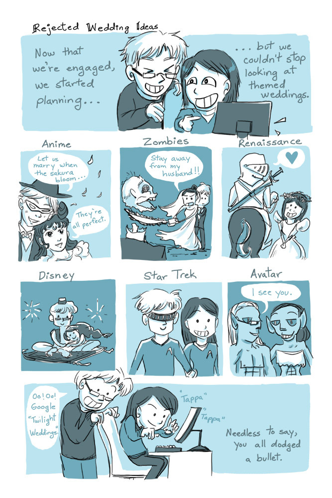 More pages from my fiance and my wedding comic favor. We each had 7 pages for the book, where each page is a vignette about wedding planning, family, life, etc. This is one of the pages from mine.