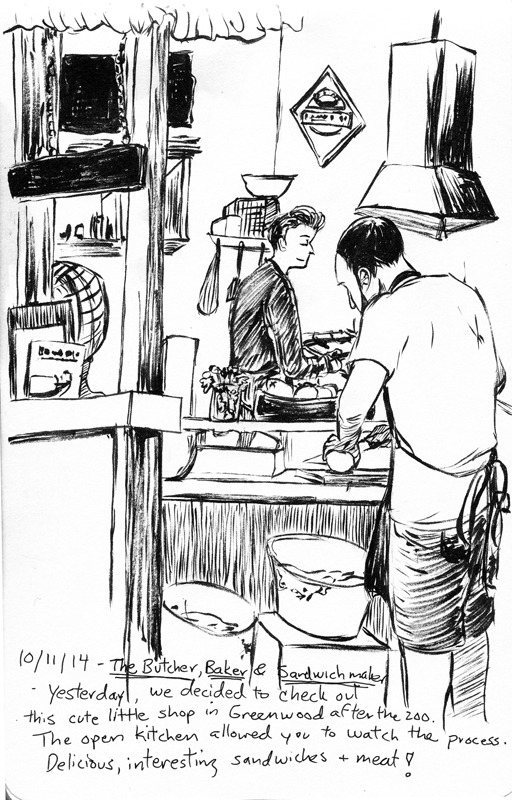 #Inktober, Day 11: This is a bit of a cheat. I did the pencil sketch yesterday while my husband and I were having lunch at this wonderful little shop in the Green Lake neighborhood of Seattle called, “The Butcher and the Baker”. I did the inks today so I’m counting it!