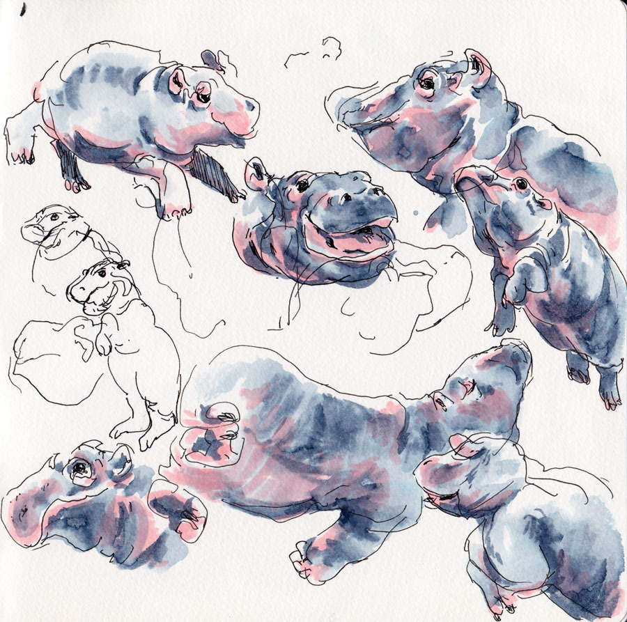 Doing more Fiona the Hippo studies after visiting her at the Cincinnati Zoo awhile back. This is also an experiment with the Kuretake Zig Clean Color blue-gray brush pen I picked up over the weekend. You can use water to dilute the ink to give it a watercolor-like quality. It also plays well with Copics (since they’re alcohol-based)!