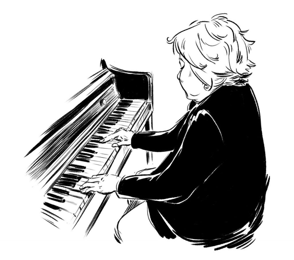 My aunt, who’s coordinating my grandma’s 90th birthday party reunion, requested a drawing of my grandma playing the piano that would be used for the tote bag party favors. The piano has always been a big part of my life, and my grandma is a huge contributing inspiration. She would tell stories about WWII, when her town was occupied by the Japanese, and how even the Japanese soldiers would stop to listen to her play. To this day, she still plays the piano, and from memory to boot!