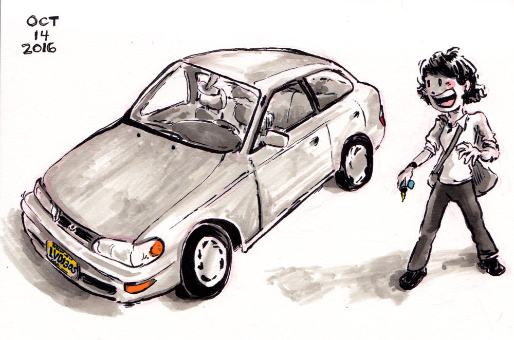 #Inktober2016 Day 14: When I was 17, I remember coming home from my part-time job and saw a strange car parked in front of my parents’ house: a 1996 Corolla DX. Upon asking whose car that was, my parents gave me the key. 15 years and 225, 000+ miles later, this car has paid for itself many times over. My Corolla carried not only my underclassmen friends in high school, but a hitch hiker. It’s made a pit stop for shady beef jerky in a Foodtown parking lot in Jersey. It followed me all the way to Savannah, GA where I went to art school. We made trips to the beach, to the Oglethorpe Mall, and of course, Monty, the computer art academic building. My car came with me when I landed my first job in the game industry in North Carolina, then my next job in Maryland, and even followed me across the country to my current state of residence. It has driven 10 hours in a snow storm as I tried to visit my husband, then fiance, during our long distance relationship. It has nail polish glitter on the dash where my sister tried painting her nails (and my bobble-head Stitch figurine) while I was driving. It has carried belongings, friends, family, dogs, and flowers. It has seen plenty of repairs later on in its life to the point that the mechanics know me on a first name basis. “Corollas are just good cars. They last forever,” everyone tells me.