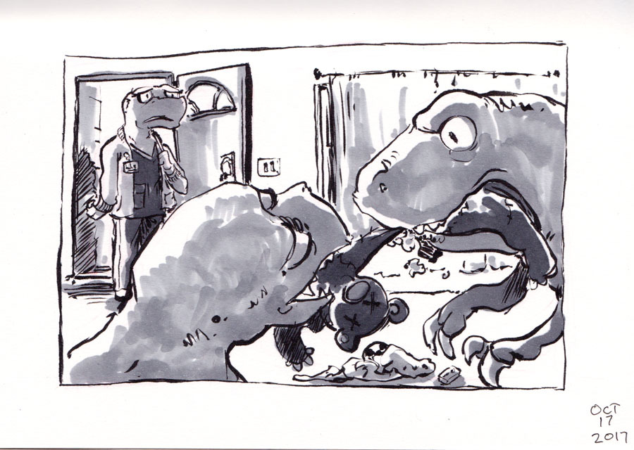 #Inktober Day 17: My cousin, Nat, requested 2 baby t-rexes fighting over a toy so here it is! As I drew this, I’m reminded of my Mom who had to work 12 hr. night shifts at the hospital as a nurse, only to come home in the morning to make sure my sisters and I made it to school, were fed, and went to all our after school activities. My cousins and I all had moms who worked (usually in medicine) while raising us, and I have nothing but admiration to them.